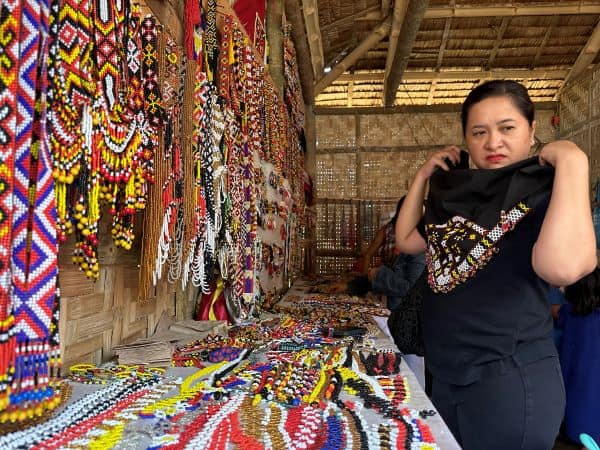 KAAMULAN SOUVENIRS. Department of Tourism (DOT) Regional Director Marie Elaine Salvana Unchuan wears a beautiful scarf displayed as she visited a souvenir shop during the celebration of Kaamulan Festival 2024 in Malaybalay City, Bukidnon. RD Unchuan also lauds the authenticity of the participants of the street dancing who are true natives of the seven tribes of the province. Photo by Gerry Lee Gorit