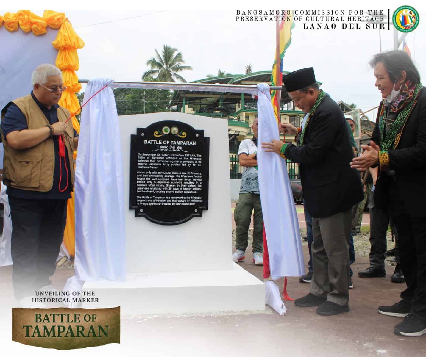 On September 25, 2025, on the 83rd anniversary of the Battle of Tamparan, the Islamic Municipality of Tamparan, Bangsamoro Commission for the Preservation of Cultural Heritage (BCPCH)-BARMM and BCPCH-Lanao del Sur, unveiled a historical marker at the Tamparan Municipal Grounds to commemorate the valor and sacrifice of the Meranaw warriors in the historic battle that Sophia University Professor Emeritus Kawashima Midori said was notable for three points: