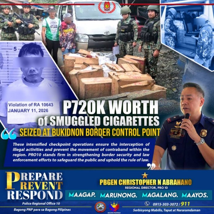 CAMP ALAGAR, Cagayan de Oro City – Personnel of the 1003rd Maneuver Company, Regional Mobile Force Battalion 10 (RMFB10), in coordination with the Bukidnon Provincial Intelligence Unit (BUKPIU) and the San Fernando Municipal Police Station (MPS), successfully seized alleged smuggled cigarettes and apprehended an individual during a joint checkpoint operation at the Regional Border Control Point in Brgy. Kalagangan, San Fernando, Bukidnon, on January 11, 2026.
